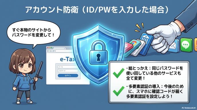 偽サイトにe-TaxのIDやパスワードを入力してしまった場合は、すぐに本物のe-Taxサイトからパスワードを変更してください。もし同じパスワードを他のサービス(SNSやネットバンキングなど)でも使い回しているなら、それらも全て変更が必要です。今後のために、スマホに確認コードが届く「多要素認証」を設定しておくと安心です。