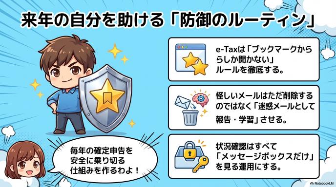 「メールのリンクは絶対に踏まない」というルールを自分の中で徹底しましょう。e-Taxの公式サイトや確定申告作成コーナーは、あらかじめブラウザにブックマークしておき、必ずそこからアクセスする癖をつけてください。