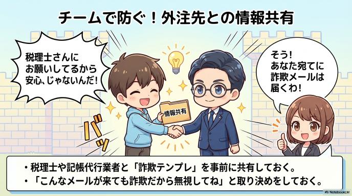 税理士さんや記帳代行業者に依頼している場合でも、あなた宛に詐欺メールは届きます。「こんなメールが来たら詐欺だから無視してね」と、一緒に仕事をしているメンバー間で情報を共有しておくことが大切です。