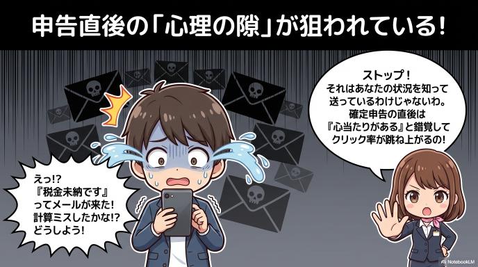 なぜこの時期に詐欺メールが急増するのでしょうか?それは、詐欺師たちが「今なら騙される人が多い」と知っているからです。確定申告という一大イベントの前後だからこそ、私たちの心には「隙」が生まれやすくなっています。