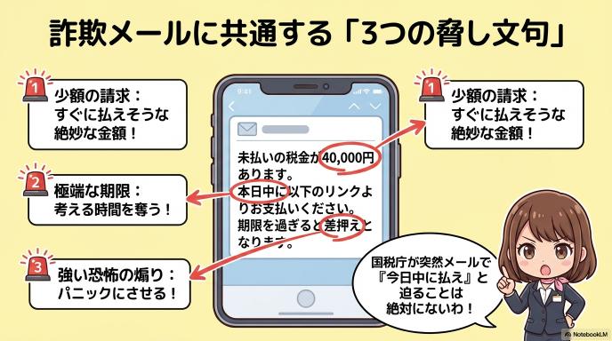 「未納金が40,000円あります」「本日中に支払わないと財産を差し押さえます」といった具合です。あえて数万円という「すぐに払えそうな少額」を提示し、「今日中」「最終通告」という言葉で考える時間を奪います。国税庁が突然メールで「今日中に払え」と迫ることは絶対にありませんので、この3点セットが出たら詐欺を疑いましょう。