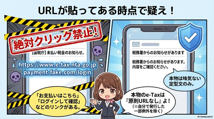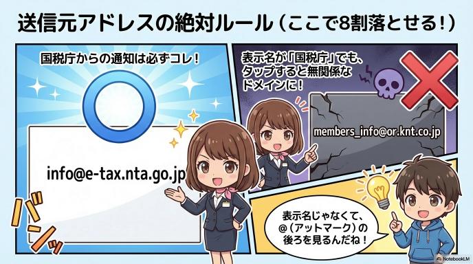 詐欺メールは巧妙に作られていますが、国税庁が送る「本物のメール」のルールを知っていれば、一瞬で偽物を見抜くことができます。国税庁はルールに則ってしか連絡をしてきません。