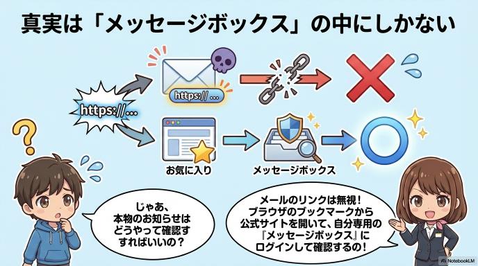 また、原則としてメール本文にURL(リンク)は記載されていません。 (※ただし、あなた自身が手続きをして発行した「ワンタイムURL」のお知らせなど、一部の例外を除きます)。見知らぬURLが貼ってあったら絶対に押してはいけません。