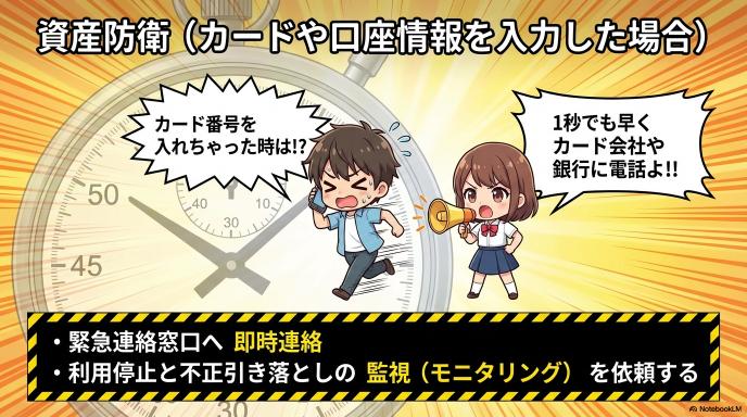 クレジットカード番号や銀行口座の情報を入力してしまった場合は、1秒でも早くカード会社や銀行の緊急連絡窓口に電話してください。カードの利用停止や、不正な引き落としがないかの監視(モニタリング)をお願いしましょう。