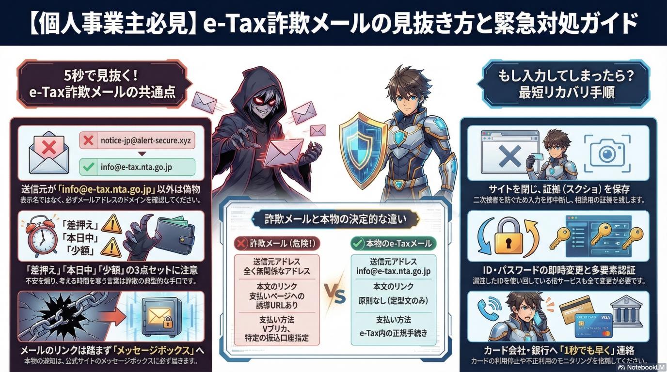 確定申告のシーズンになると、個人事業主の不安や焦りにつけこむような「e-Tax(国税庁)」を名乗る詐欺メールが爆発的に増えます。