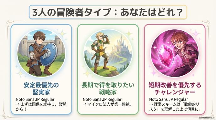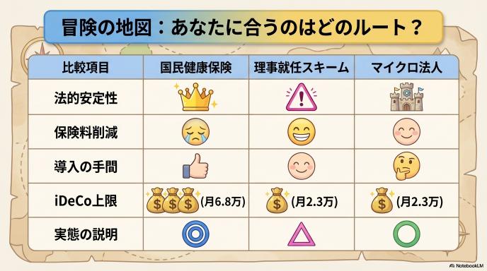 【徹底比較】国保・理事スキーム・マイクロ法人、あなたに合うのはどれ?