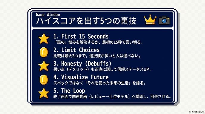 「デザイン、重さ、色、バッテリー、価格、音質…」と全部を比較するのではなく、「この3つの商品は【価格・音質・使いやすさ】の3点で比較します」と軸を絞ってあげましょう。視聴者の頭の中が整理されて、購入ボタンを押しやすくなります。