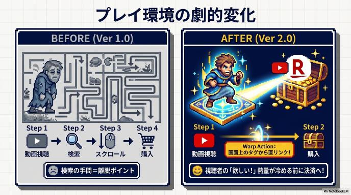 今回の提携により、YouTubeのシステムと楽天市場のシステムがガッチリと手を組みました。これにより、動画を通じたお買い物の流れが劇的に変わります。