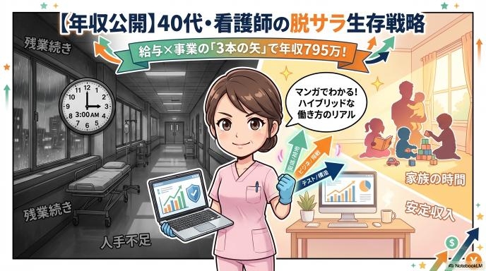 【年収公開】40代・初心者が開業3年目で看護師時代の給料を超えた話。給与×事業の「3本の矢」戦略とは?